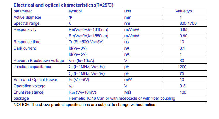 4. Current Dark: 0.1nA 3nA @ 0 V-5 V