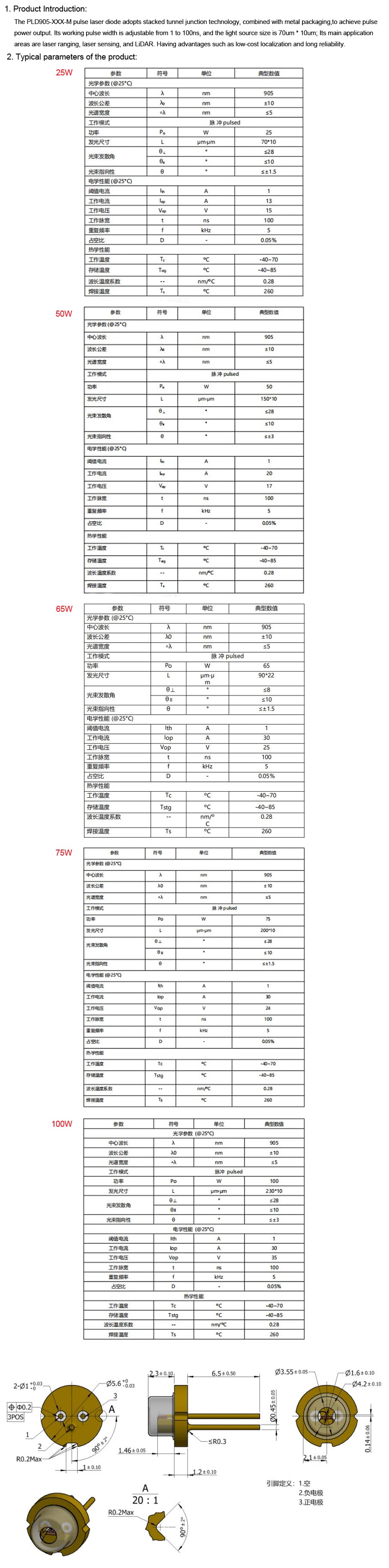 The PLD905-XXX-M pulse laser diode adopts stacked tunnel junction technology, combined with metal packaging, to achieve pulse power output. Its working pulse width is adjustable from 1 to 100ns, and the light source size is 70um * 10um; Its main application areas are laser ranging, laser sensing, and LiDAR. Having advantages such as low-cost localization and long reliability.
