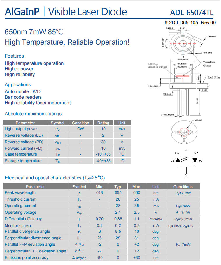 650nm 7mW 5.6mm 85℃ High Temperature Visible Laser Diode Red Laser Diode