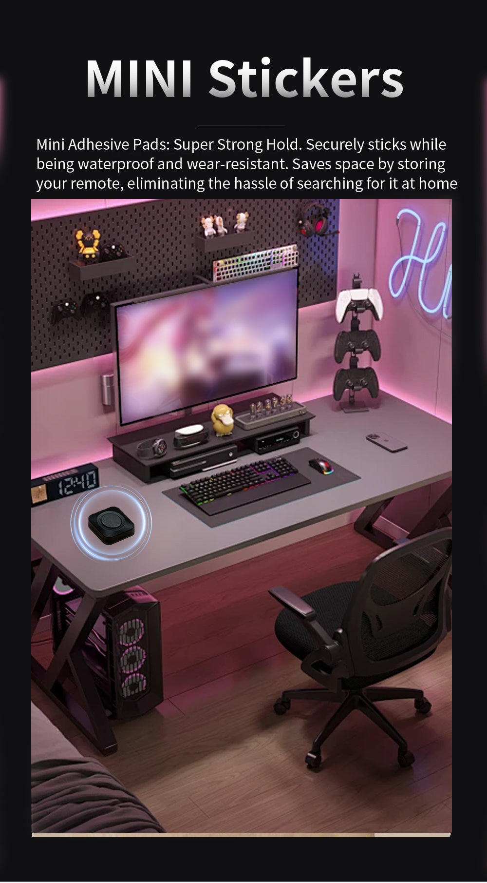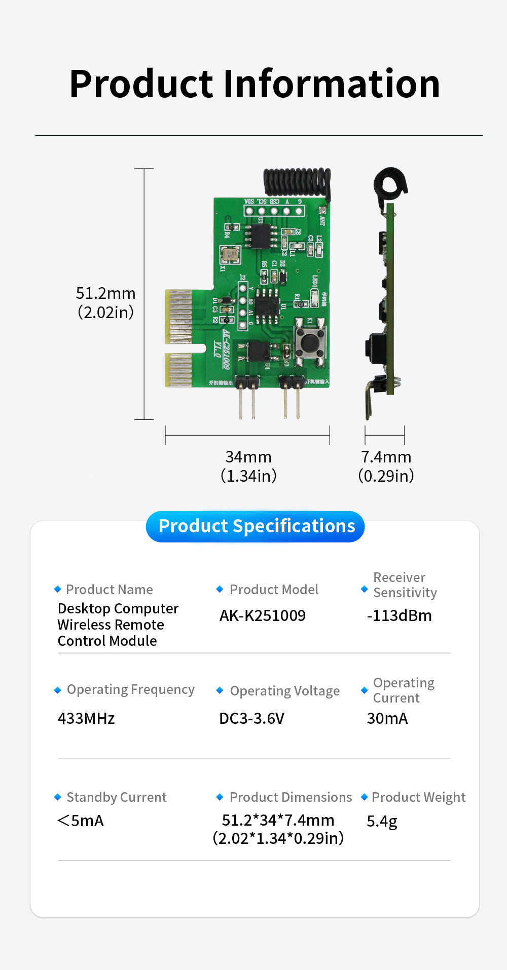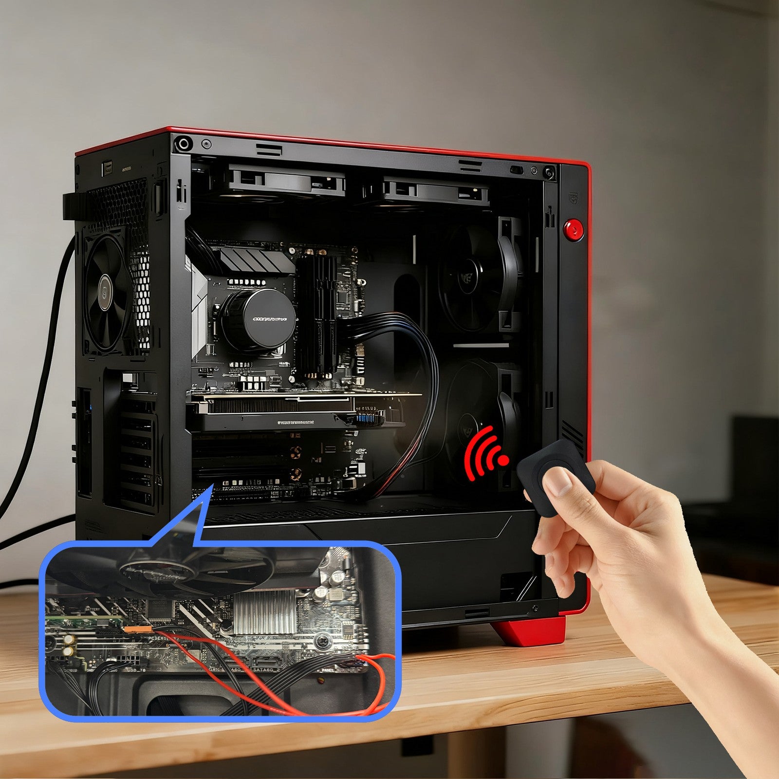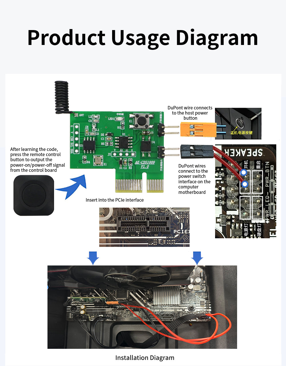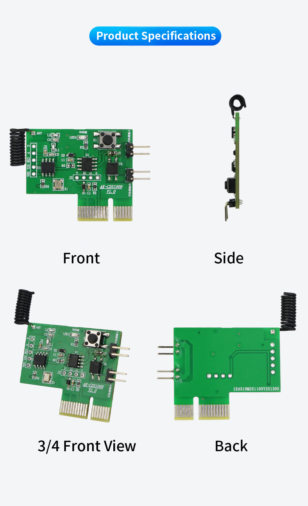 A wireless remote control desktop computer power on/off controller is a hardware device that uses wireless radio frequency (RF) signals to remotely control desktop computer power on/off operations. Paired with a Mini square one key remote control and a dedicated desktop computer power on/off controller, it is easy to modify the desktop computer power on/off function. Say goodbye to the tedious process of bending down to find the host button. With simple installation, you can achieve one click power on and off through remote control buttons, greatly improving the convenience of operation.