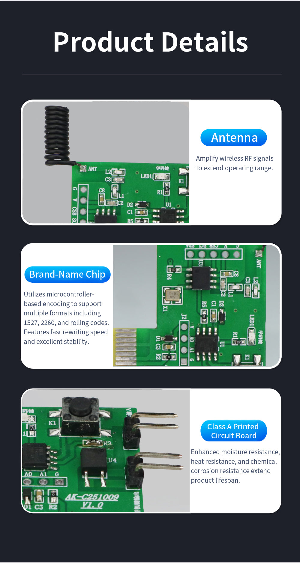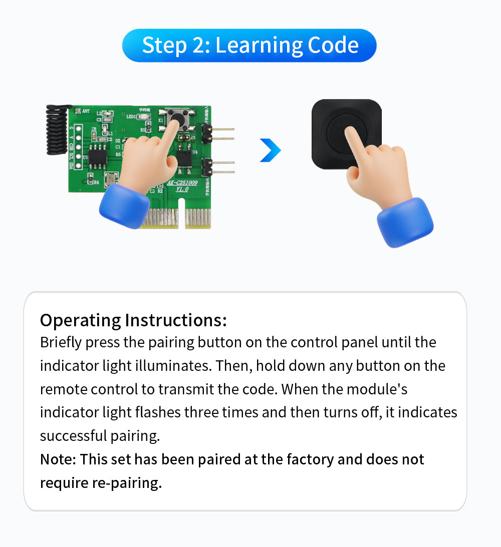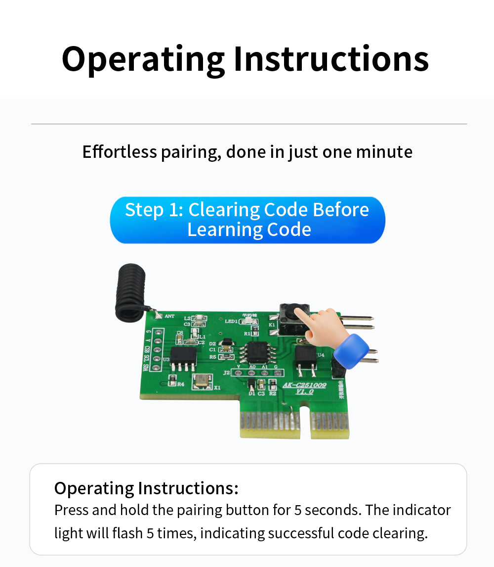 (2) Clear code operation: Press and hold the code button for 5 seconds, and the indicator light will flash 5 times, indicating successful code clearing.