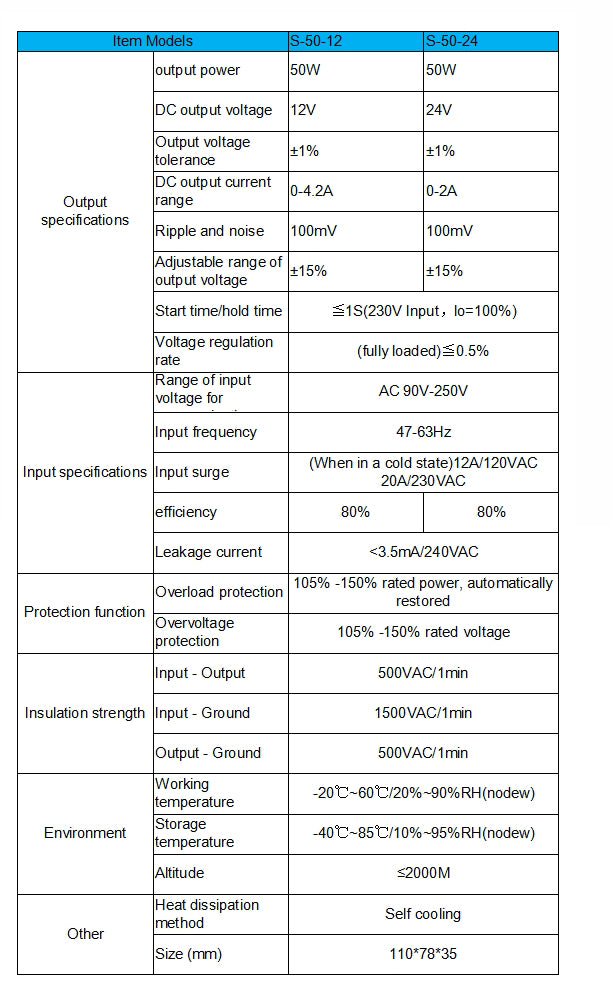 S-50-12/S-50-24 LED Strip Power Switch Power Supply DC12V4A/DC24V2A 50W